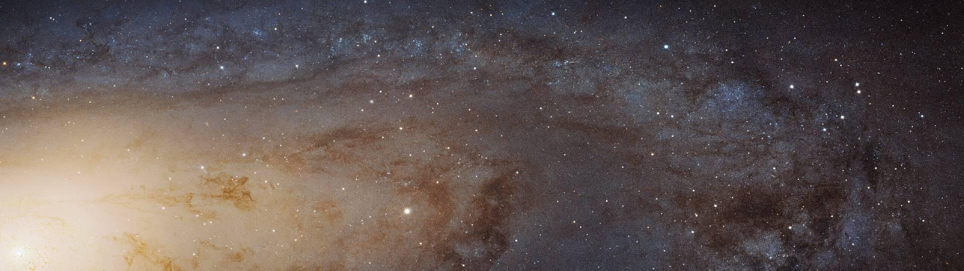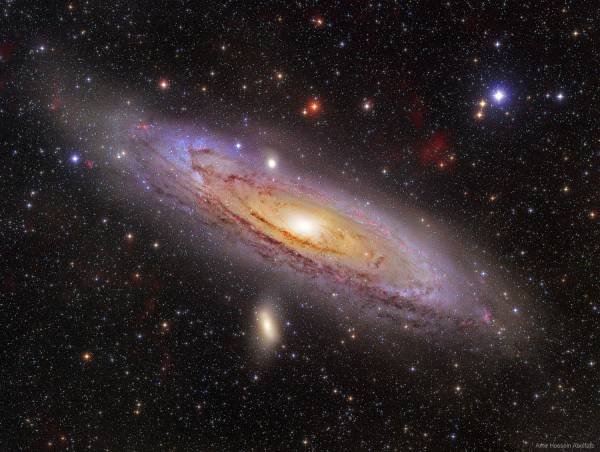 如果没有望远镜,即使是这个巨大的螺旋银河,在仙女座星群中也只能看到一团不起眼、微弱的星云。但是,在这张令人惊叹的六小时望远镜数位合成图中,记录了我们最近的主要银河邻居的亮黄色核、黑暗蜿蜒的尘埃带、发光的蓝色旋臂和亮红色的发射星云。