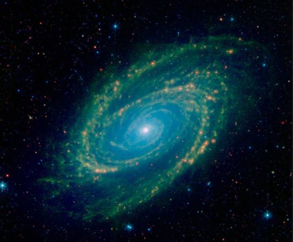 这张邻近波德星系(Messier 81)的影像是由NASA的斯皮策空间望远镜拍摄的。该星系位于大熊座(北斗七星也位于该星座)的北部。想要欣赏该星系景象的天文爱好者可以借助双筒望远镜或小型望远镜来观测它。M81距离我们1200万光年,这是斯皮策空间望远镜于2003年8月发射后不久首批公开发布的资料集之一。