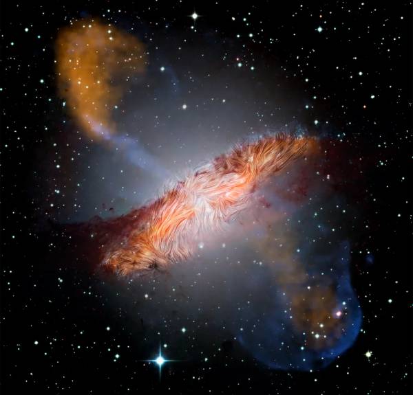 半人马座 A,也称为 NGC 5128 或 Caldwell 77,是位于半人马座的一个星系。该图像是在欧洲南方天文台(The European Southern Observatory)和阿塔卡马探路者实验(Atacama Pathfinder Experiment)收集的数据的帮助下形成的,影像中显示的数千条线是美国太空总署平流层红外线天文台观测到的磁场。