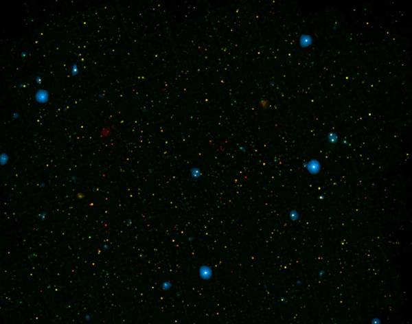 这张照片捕捉了多个星系的景象,以蓝点的形式可见,被称为宇宙场。这些星系大多包含发射高能量X射线的超大质量黑洞。这些黑洞是由NASA的核光谱望远镜阵列(NuSTAR)侦测到的,NuSTAR在该场中发现了32个这样的黑洞,迄今已在整个天空中观测到数百个黑洞。除了蓝点外,其他彩色点是包含发射低能量X射线的黑洞的星系。