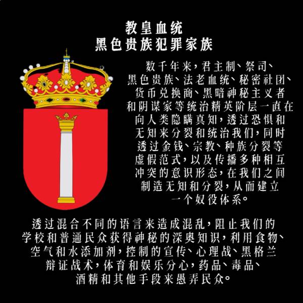 教皇的血统来自黑色贵族家族(Black Nobility),奥西尼家族(Orsini Family)、马西莫家族(Massimo)等等。基本上,黑色贵族、罗斯柴尔德家族(The Rothschilds)、洛克斐勒家族(The Rockefellers)和温莎家族,都是这些”爬虫族”的后裔。他们要么是纯血统,要么是混血后代。他们在等级制度中分裂成各种秘密社团,每个秘密社团负责洗脑的不同方面。他们使用了分而治之的策略。他们毒害食物、空气和水源;他们给我们注射药物,以削弱我们的身体、削弱我们的心智,使我们更容易被精神控制。他们使用各种心理战,例如“9·11”和“新冠”。他们一直在使用所谓的黑格尔辩证法,对于那些不知道黑格尔辩证法是什么的人来说,就是他们: