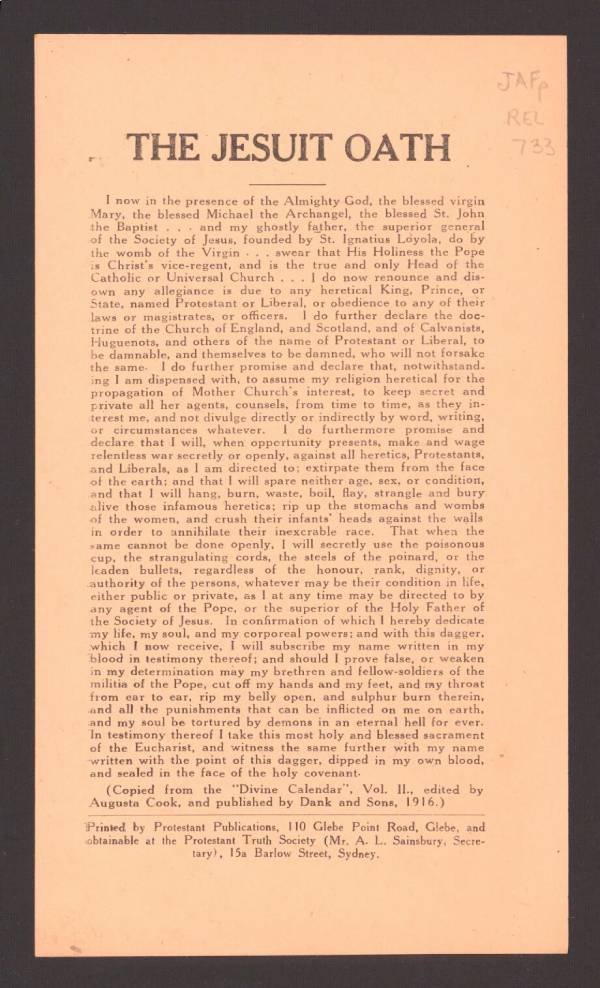 下面是一小段耶稣会士的誓言(The Jesuit Oath),上面完整版比这长得多。但节选足以让你们了解这些人是谁: