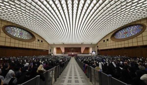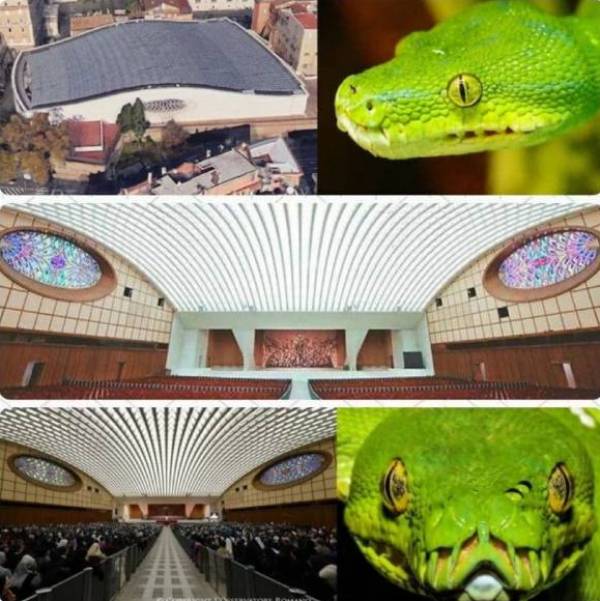 这是礼堂的入口,走进礼堂,你可以看到一条蛇的两只眼睛和毒牙。台上是教宗本笃十六世(Benedictus XVI),这个场景看起来神圣吗?不可否认,它看起来非常非常邪恶。