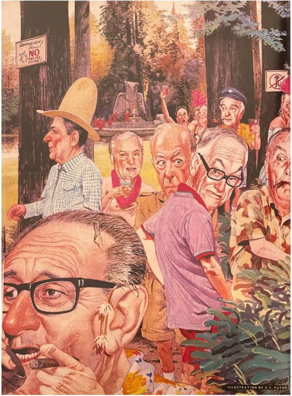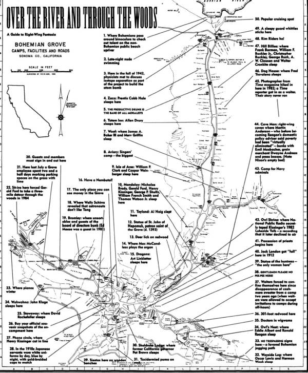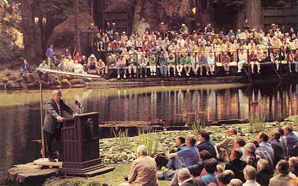 米歇尔·罗卡尔,当时的法国总理,非常重视这场秘密行程。不应该有人知道他正在仰望食鱼鹰和火鸡秃鹰;不应该有人知道他同前美国国务卿和现任财政部长以及大卫·洛克菲勒(David Rockefeller )一起聆听苏联演讲者的讲话,其他还有阿奇尔-丹尼尔斯-米德兰公司(Archer Daniels Midland Company)的董事长德韦恩·安德烈亚斯(Dwayne Andreas)、媒体大亨梅尔夫·格里芬(Merv Griffin)和冷战时期美国最富盛名的明星主播沃尔特·克朗凯特(Walter Cronkite);不应该有人知道,第二天罗卡尔本人会在湖边,在绿色的演讲者遮阳伞下发表演讲。当橙红色的蜻蜓在水面上翩翩起舞,牛蛙发出叫声时,罗卡尔会向前倾身说道:“因为你们是如此杰出的一群人,所以我可以私下里和你们交谈。” 这番话巧妙而迷人,旨在讨好波希米亚丛林俱乐部的成员们。美国第40任总统罗纳德·里根(Ronald Reagan)在俱乐部的一次演讲时说,格罗夫是他’思乡’的主要原因,后面还跟了一个关于男人们的厕所笑话。