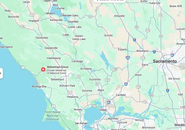 距离蒙特里奥小镇中心只有约1英里处,有一片占地2700英亩的私人营地,就坐落在这一片古老的红杉林中,名为波希米亚格罗夫或波希米亚丛林(The Bohemian Grove)。它隶属于成立于1872年的私人绅士会所“波希米亚俱乐部”,六年后开始举行夏季露营的传统。一个林地保护组织曾以每英亩4800美元的价格购买了附近的一块土地,这意味着光是俱乐部这块土地的价值就至少高达1300万美元。