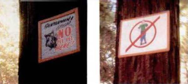 虽然喝下一加侖啤酒然后对着雄伟的红杉树小便这种粗俗的行为看起来像是玩世不恭地重现大学兄弟会式的幼稚举动,​​但它却反映了旧的保守主义观念,即在他们的”上帝”的计划中,男人(尤其是白人)远高于自然。这是营地里最引以为傲的仪式,是权贵可以随地小便的自由,这些权贵人士对着红杉树粗壮的树根小便,甚至有一棵树是专门的“小便树”,经常被用来小便,而这些人正是在华盛顿游说在北极钻探石油,并且对人类导致地球温度危险变化的作用漠不关心的人。当然,这项权利也有受限的时候。唯一受到限制的地方,就是用餐区附近几棵著名的红杉树。其中一棵倒楣的树上钉着一块牌子,上面写着:各位先生们,请注意,请勿在此小便!