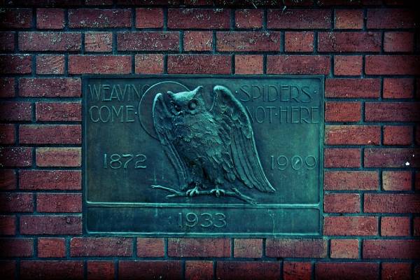 走进建筑仔细观察,你会发现外墙上有一幅猫头鹰的蚀刻画,它正凝视着你。但这并非普通的猫头鹰,它看起来格外惊恐,周围环绕着”织网蜘蛛勿入”的字样。这句出自莎士比亚《仲夏夜之梦》的台词,是该俱乐部的座右铭。