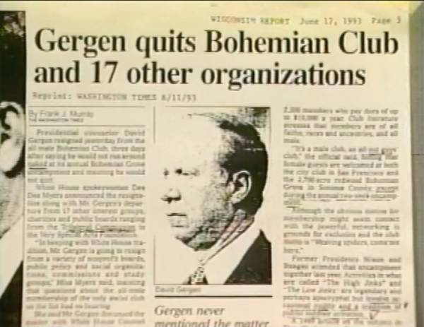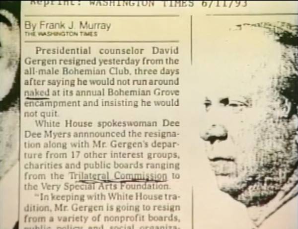 "总统顾问大卫·格根在1993年6月16日辞去了全男性成员的波希米亚俱乐部职务,此前三天他曾表示不会在该俱乐部一年一度的波希米亚丛林营地活动中裸体地走来走去 ...。"