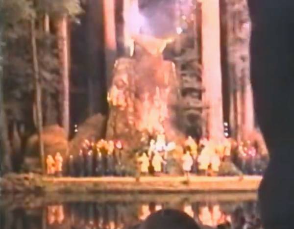 播放了十分钟左右的乐曲后,仪式开始。一群穿着长袍打扮成’树精’的人,手持燃烧的火炬,在一个巨大且长满了苔藓的猫头鹰神殿前类似舞台的装置上走来走去。这些长袍的设计风格让人联想到三K党,但又像是出自芬兰设计品牌玛丽美歌(Marimekko)之手。他们开始唱着关爱的歌,讲述了一个人的心是如何在”现实”和”幻想”之间分裂的;以及逃离到另一个充满人际情谊的世界是多么必要。这种景象隐约地弥漫着同性恋的意味,就像树林里许多仪式化的生活一样。