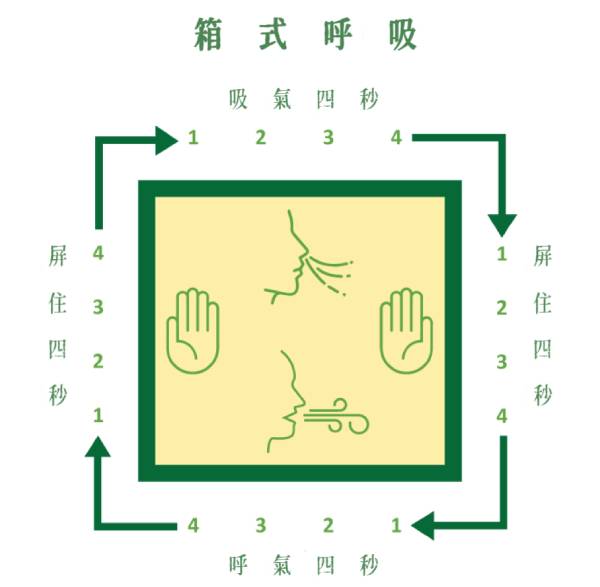 箱式呼吸,也稱為四方呼吸,是一種簡單的呼吸技巧,包括吸氣、屏住呼吸、呼氣和屏住呼吸,持續時間相等,通常每次四秒。這種結構化的模式類似於箱子的四個側面,可以幫助調節神經系統、減輕壓力並提高注意力。 坐姿: 1, 盤腿坐,雙手自然放在兩腿上; 2, 或坐在椅子上,雙手自然放在兩腿上,雙腳平放在地上; 3, 或盤腿坐/坐在椅子上,一隻手放在胸前,另一隻手放在小腹處,感受呼吸。 閉上眼睛,慢慢呼與吸。