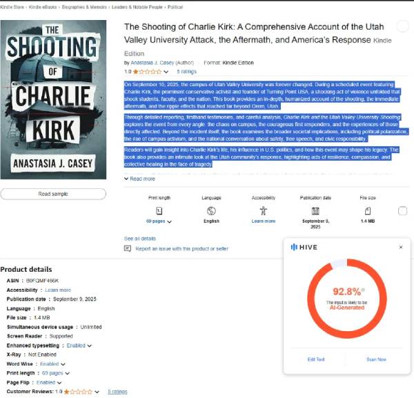 查理·柯克(Charlie Kirk)事件。亞馬遜上出現了一本關於查理在2025年9月10日被暗殺的書,但出版時間為2025年9月9日,暗殺前一天出版,通常亞馬遜需要72小時才能將一本新書上架,無論從哪方出面澄清狡辯都無法說服大眾。他們想在美國製造內戰,左翼對抗右翼,這些都是虛假的分裂。種種劣跡都被民眾立刻就看穿了,當然,並不是每個人都能看穿。