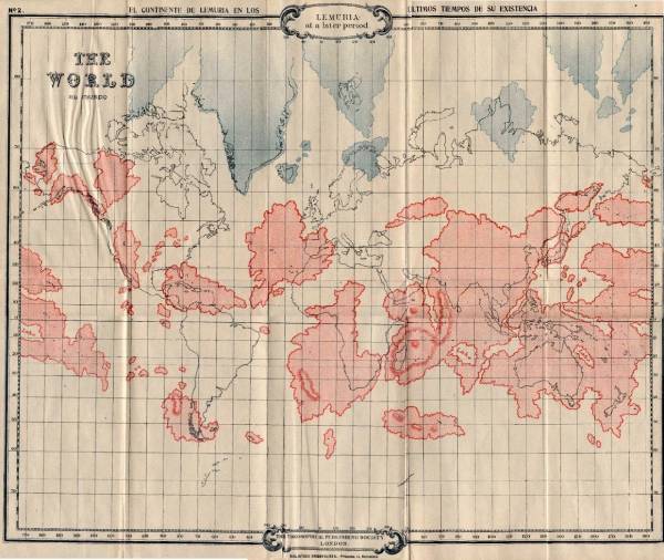 灵性学家威廉·艾略特(Willam Elliot)在其著作《亚特兰蒂斯与失落的利莫里亚的故事》中绘制的利莫里亚地图,叠加在现代大陆地图之上。他设想利莫里亚是一块巨大的大陆,后来沉入海底,只留下一些小岛。图片由维基百科提供。
