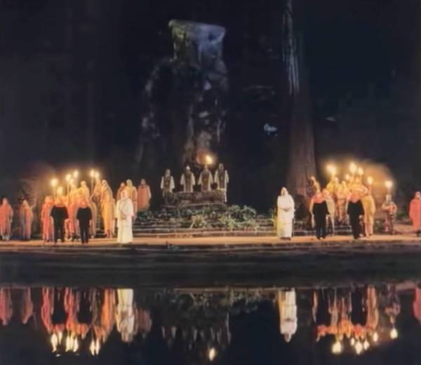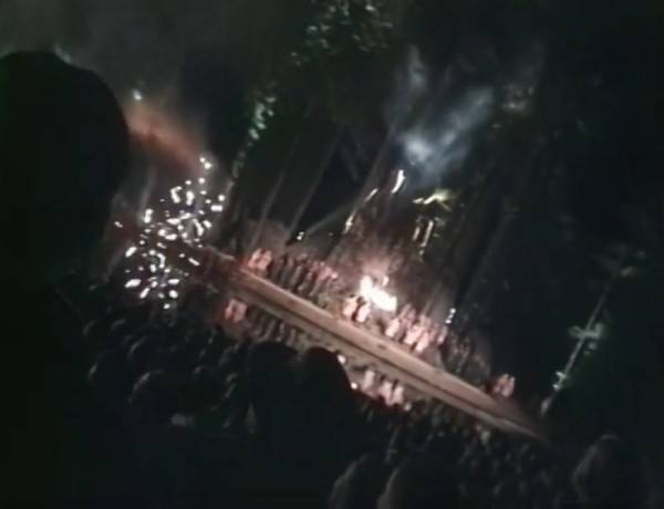 播放了十分鐘左右的樂曲後,儀式開始。一群穿著長袍打扮成’樹精’的人,手持燃燒的火炬,在一個巨大且長滿了苔蘚的貓頭鷹神殿前類似舞台的裝置上走來走去。這些長袍的設計風格讓人聯想到三K黨,但又像是出自芬蘭設計品牌瑪麗美歌(Marimekko)之手。他們開始唱著關愛的歌,講述了一個人的心是如何在”現實”和”幻想”之間分裂的;以及逃離到另一個充滿人際情誼的世界是多麼必要。這種景象隱約地瀰漫著同性戀的意味,就像樹林裡許多儀式化的生活一樣。