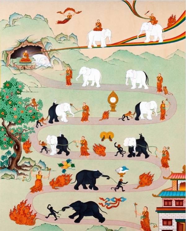 此外,我們還將深入研習"九住心"(即"止"禪修的九個階段),正如那幅描繪了一位僧人、一頭大象與一只猴子在修行之路上前行的畫作中所呈現的那樣。