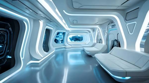 进入房间后,你会发现自己身处一条短走廊,右边有一个壁橱,里面有手动操作的木制滑动门。有时里面有玻璃板,左边有通往小浴室的门。向前走,是主卧室,里面有一张靠在浴室墙上的沙发和一张床,床头朝向外面的六角形大窗户。这扇大窗户没有玻璃,它由与主船体相同的多晶型材料制成,其分子以晶体方式排列,因此是透明的。你在触摸玻璃的任何位置的同时向上或向下滑动手指,可以命令将窗户设置为分开或不透明,并且可以设置为任何所需的程度。有时,如果需要,这些窗户还会有装饰性窗帘。除了床和可以变成另一张床的沙发之外,卧室中两张床头柜,两侧各有台灯,带有封闭隔间的书架,用于存放私人物品,一张带有全息计算机终端的桌子,可连接到船上的主要人工智能。如果需要的话,还有一台数字计算机。