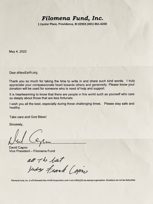 菲洛梅纳基金(Filomena Fund)的灵感来自普罗维登斯市(Providence, Rhode Island)法院法官法兰克·卡普里奥(Frank Caprio)的热门节目“Caught in Providence”的观众自发的慷慨,该节目通过电视直播卡普里奥法官的司法工作以及他在对待那些出现在法庭上的民众富有同情心的态度。