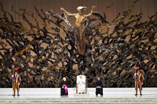 这是礼堂的入口,走进礼堂,你可以看到一条蛇的两只眼睛和毒牙。台上是教宗本笃十六世(Benedictus XVI),这个场景看起来神圣吗?不可否认,它看起来非常非常邪恶。