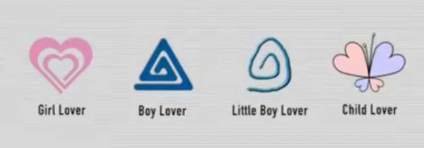 不知道的人,只会认为它是一个三角形的符号,它实际上是一个恋童癖的象征,代表着对小男孩的爱。如你所见,它绣在教宗的长袍上。这就是他们在清楚地告诉你,他们就是恋童癖者。看看这张图标,美国联邦调查局(FBI)其实有所有黑暗符号的列表。在这些话题被提及时,他们使用另一个象征或符号”披萨”互相沟通交谈。披萨代表小女孩,热狗代表小男孩。如果你看过好莱坞节目或是像艾伦秀脱口秀节目(The Ellen Show),她邀请过欧巴马还有希拉里,他们谈笑风生地谈论他们举办的披萨派对.... 他们当然谈论的不是食物。如上图二所示,恋童癖分恋不同的性别及年龄,也就有了相应的代表符号。