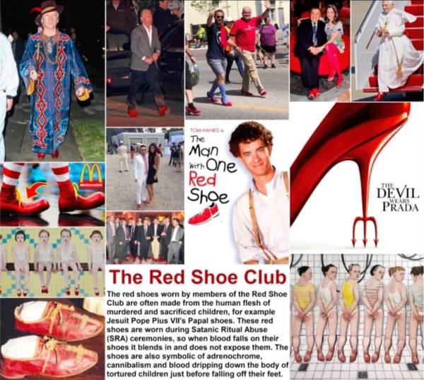 为什么是'红鞋俱乐部'? 为什么鞋子是红色的?那是因为,当他们进行撒旦仪式并虐待儿童时,血会滴得到处都是,红鞋是一种遮盖鞋子上的血迹的方法。